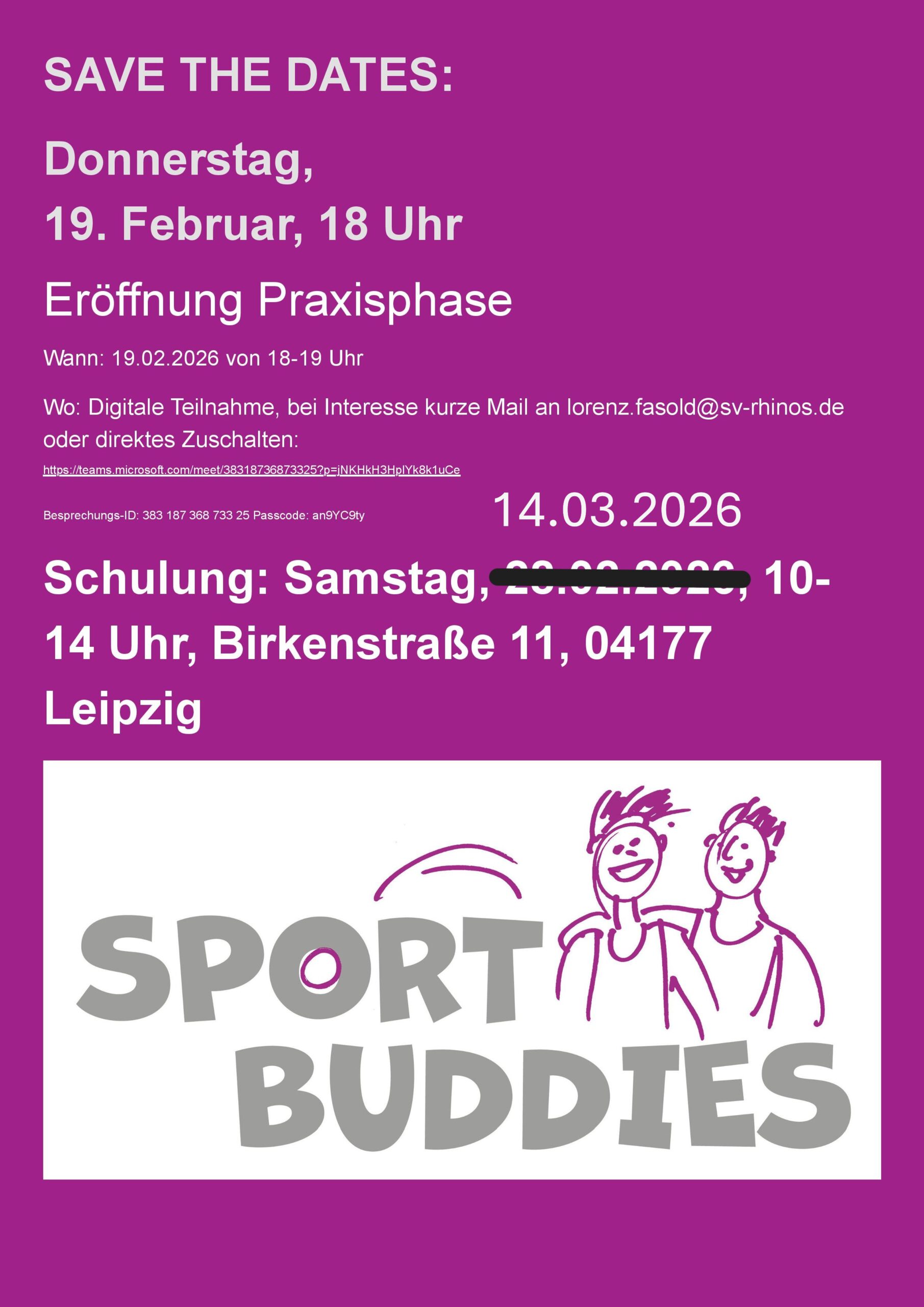 Für unser Projekt suchen wir weiterhin Ehrenamtliche, die bestenfalls schon am 14.03. zu unserer Schulung dabei sein können. Bei Interesse und Fragen wendet euch an: lorenz.fasold@sv-rhinos.de. Eine Aufwandsentschädigung für die Buddy-Tätigkeit ist vorgesehen.